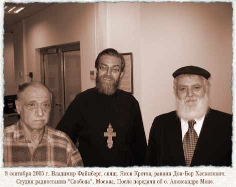 С христианской точки зрения15-я годовщина гибели священника Александра МеняВедущий Яков Кротов Яков Кротов: Наша программа посвящена 15-й годовщине гибели священника Александра Меня. О смысле его жизни, о наследии. Александр Мень - еврей, русский интеллигент, православный христианин и священник. У нас сегодня в гостях бывший прихожанин отца Александра Меня, писатель, автор 16 книг Владимир Львович Файнберг, сейчас готовится к изданию его 17-ая книга "Словарь для Ники". И у нас гость из-за рубежа, из Америки, раввин Дов-Бер Хаскелевич, из Бруклина. Итак, Александр Мень. Родившийся в 1935 году и зарубленный неизвестными лицами 9 сентября 1990 года, - это был воскресный день, на пути в Церковь из своего дома был отец Александр. Неизвестные его остановили по дороге на станцию "Семхоз" под Загорском. Затем два часа после того, как ему нанесли удар топором, отец Александр лежал на тропинке, истекая кровью, и прохожие спрашивали: "Что, как?" - он говорил: "Ничего, я сам, идите". Так и истек кровью. И вот Александр Мень, родился в 1935 году. Отец еврей, советский еврей, атеист. Мать еврейка, она была крещена одновременно с будущим священником православным, тому было несколько всего месяцев, в подпольной Церкви, в катакомбной Церкви, священником Серафимом Батюковым, который, не приняв курс лидеров тогдашней Московской патриархии на компромисс с Лубянкой, предпочел уйти в подполье. Мой первый вопрос нашему сегодняшнему гостю Дов-Бер Хаскелевичу такой. С Вашей точки зрения, можно ли говорить тогда об Александре Мене, как о еврее, или он вычеркнут и все?
