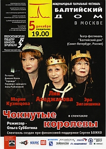 Лия Ахеджакова: Чем мне интересен этот спектакль? Во-первых, он дает спектр того, что происходит в театральном мире сейчас. Ведь это не зря Литва. Оказалось, что такая Мекка - Литва. Вот эта маленькая Литва питает нашу большую Россию своими потрясающими режиссерами. А вы смотрите, сколько замечательных литовских актеров снимается в нашем кино! Как мне не знать, что поставил Некрошюс? Как жить без этого, как работать в театре? Это же невозможно. Читать не можешь, видеть не можешь, уши заткнуты. Хотя некоторые обходятся без этого и, как мы знаем, с блеском. Они знают, что дорога, которую им выстроили изначально, она правильная. Правильной дорогой идешь, товарищ, и совершенно не обязательно знать, что интереснейшие вещи происходят в мировом театре, что они есть и они дают тебе воздух, и ты можешь иначе думать, иначе смотреть на свою работу, на режиссеров. И это нам дает именно "Балтийский дом". Я поклонница именно этого театрального фестиваля, то, что я второй раз буду в нем участвовать, это для меня просто нонсенс. Я не фестивальная актриса, конечно. Столько людей работало на этот спектакль. Притом, что слово антреприза я вообще не выговариваю. Я стараюсь делать вид, что такого нет, а есть частный проект. Это не антреприза, хотя все равно получается. Есть два продюсера, есть я, и есть человек, Сережа Башко, который, не раздумывая, дал большие деньги и не разу о себе не напомнил. В отличие от пяти предыдущих наших проектов, когда давали три тысячи долларов, снимали налог и потом звонили: "Хоть репетиции покажите, что происходит, и когда откат будет?". Это было постоянно и, поэтому, всегда было очень унизительно иметь эти деньги. То что этот спектакль состоялся, это вообще нонсенс. У меня была мечта сыграть одну совершенно замечательную роль, и мы договорились с режиссером, у нас уже была пьеса, у нас все было, но в этот момент выясняется, что в театре "Современник" то же самое название и в главной роли, о которой я мечтала, Галина Борисовна Волчек. Надо было срочно придумать другое название. Тут появилась Оля Субботина с пьесой, которую я знала. Это очень молодой немецкий автор. Как все молодые, не дописал, и все падает на головы артистов. Но так как выбора не было, мы взяли эту пьесу. Но когда мне сказали, что у меня партнерши Маша Кузнецова и Эра Зиганшина... Они, извините за слово, клюнули на меня, я клюнула на них. Мы все друг на друга. Но чем замечателен Фима Спектор, мой изумительный продюсер? Он дал мне возможность быть независимой в своем любимом театре "Современник", никогда не ждать повышения зарплаты и никогда не ждать ролей. Я свободна и делаю новую роль. Фима решил, что спектакль должен дозреть, прежде чем мы его покажем в Москве. И мы выехали на большие гастроли. Мы прошли Благовещенск, Читу, Иркутск, Новосибирск и, наконец, Барнаул. У нас в Барнауле был замечательный спектакль. Там еще зритель потрясающий. Еще не знает этот вот немецкий автор, как три немолодых русских актрисы просто суставы себе выворачивали на его эксперименте. Но надо сказать, что в пьесе есть хорошие характеры, есть несколько замечательных диалогов, а дальше - спасайся кто может. Не знаю, что будет в Москве, но в Барнауле мы вдруг почувствовали, что у нас хороший спектакль. Марина Тимашева: Литовскому артисту и советнику по культуре посольства Литвы в Москве Юозасу Будрайтису решительно 